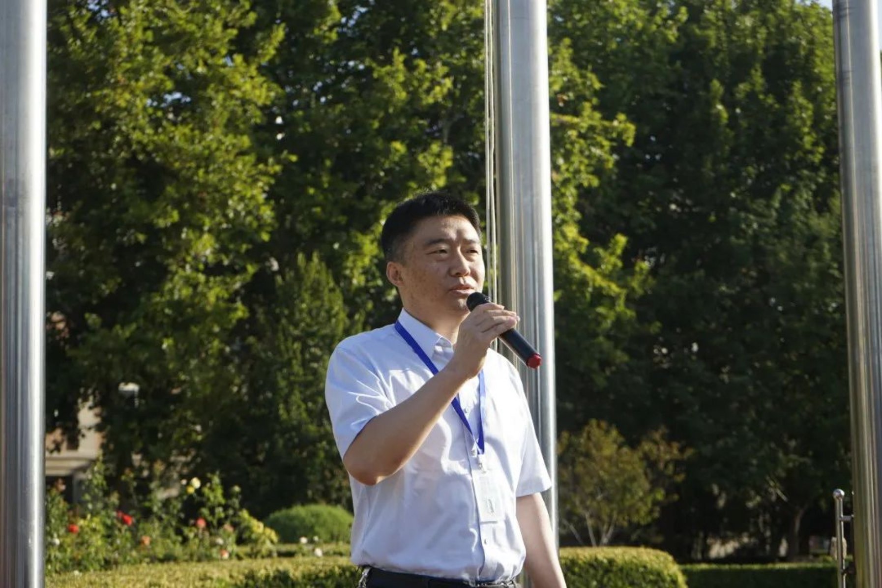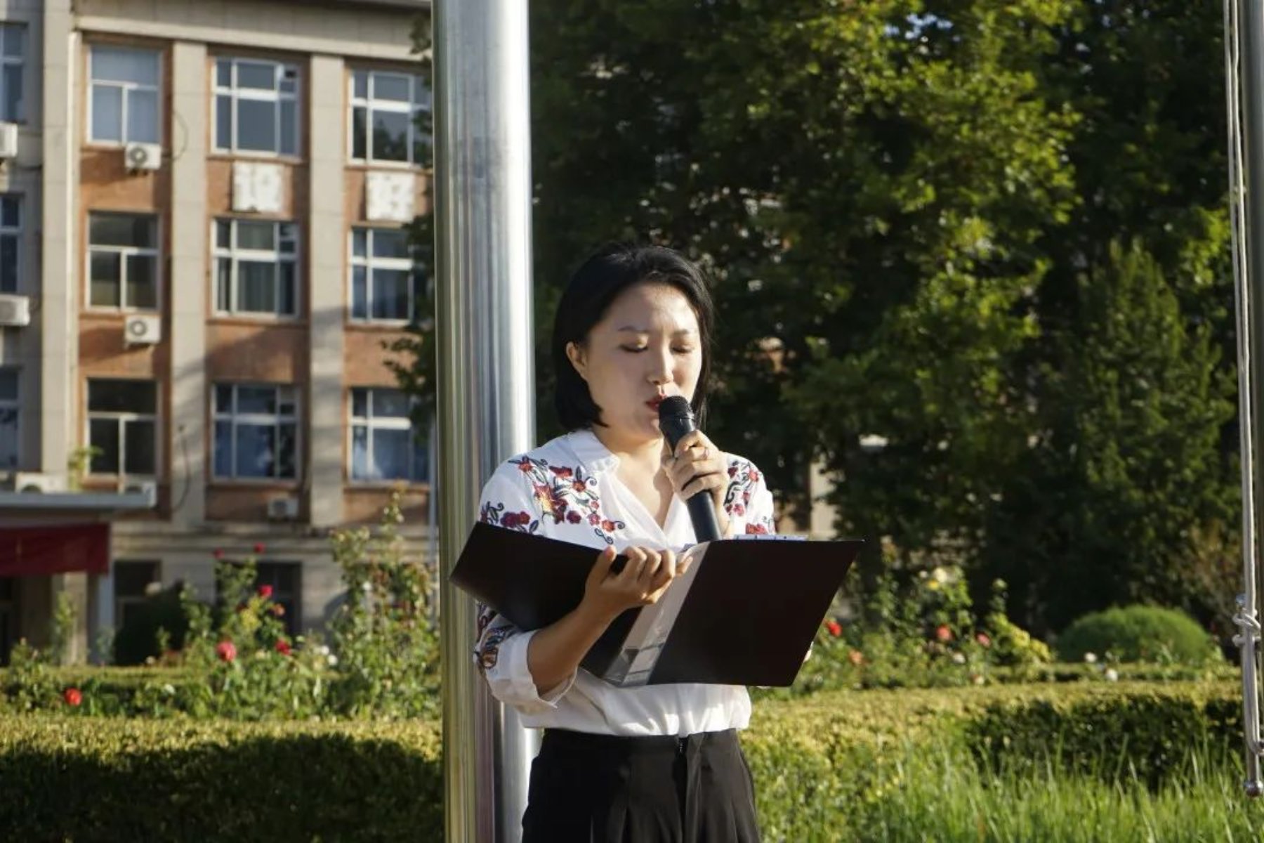 晨光秋露,清风徐来。闪耀的五星红旗在全体人员的注目下冉冉升起。老师们、同学们同唱国歌,将自己对党和国家诚挚的热爱融入歌声之中。