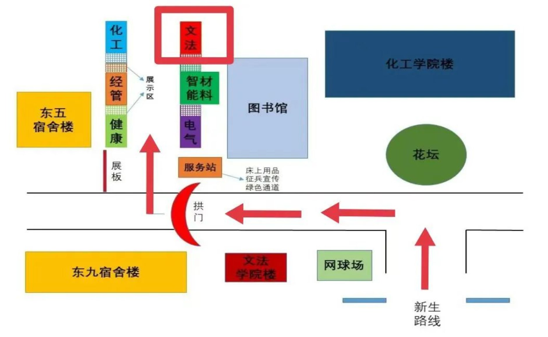 4.报道点位于红桥东院——图书馆西侧,新生们需完成核查信息、提交录取通知书和新生相关档案、接收校园卡和宿舍钥匙、接收新生教育材料、在展板上签名合照打卡等手续,即可进入宿舍。