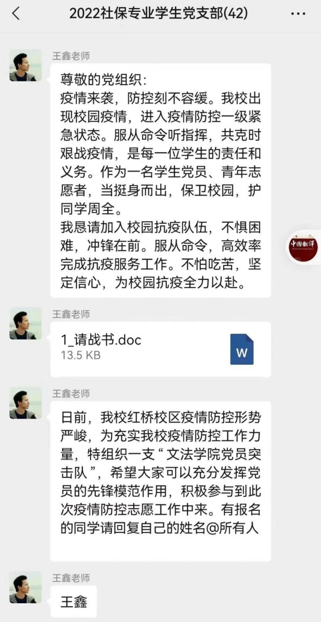点点微光,汇成星河。“岂曰无衣,与子同袍。”越是在危急关头,越是能展现文法学子的坚毅勇敢和文法黄色片 的人文精神。“寒冬阻挡不了春天的脚步,黑夜遮蔽不住黎明的曙光。”希望有更多的同学们积极加入文法黄色片 党员志愿者突击队和青年志愿者突击队,也希望师生们从自身做起,积极配合学校各项防疫措施,配合防疫人员、志愿者们的工作。风雨同舟,共克时艰,我们一起加油!