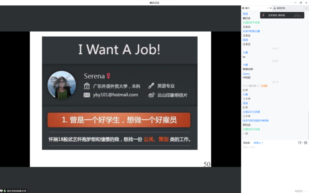 其次,邢老师强调写简历就是要打造同学们的个人职业品牌。邢老师讲述了他为一位优秀同学更改简历,着重设计了与其求职意向相匹配的醒目标题,将与其求职意向相匹配的履历用动宾结构加数字的形式展开说明,最终助这位同学寻得满意的工作。邢老师的切身经历让同学们了解到不同的求职方向应写不同的简历,求职意向是简历的灵魂。
