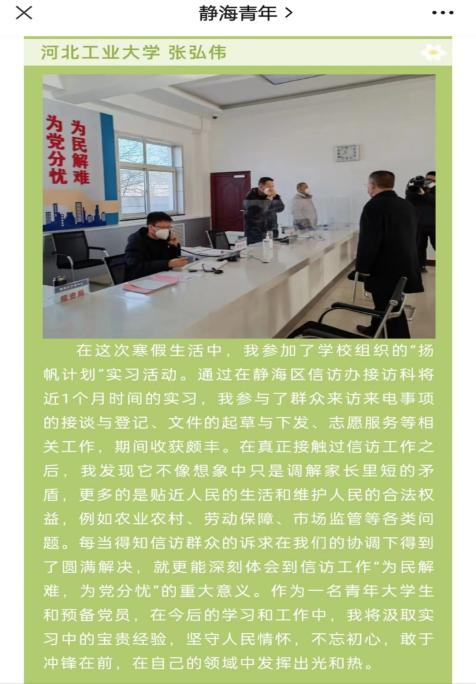 在天津市静海区信访办实习的张弘伟同学认真接待群众来访,同信访办工作人员一同下社区走访、慰问。认真的工作态度和严谨踏实的工作作风得到了实习单位的欣赏与肯定。