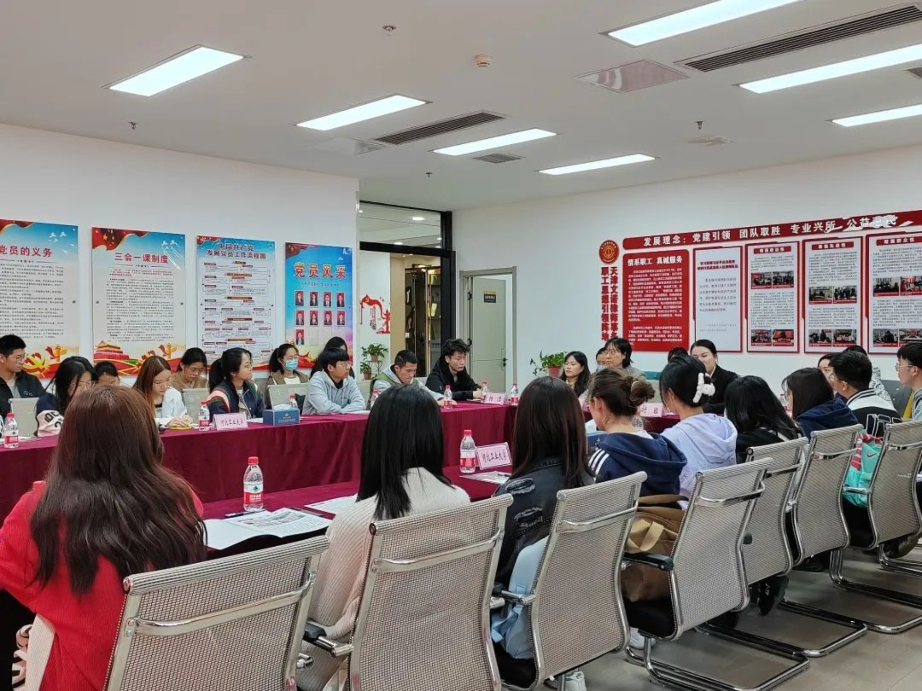 在参观律所的各个区域后,文诺律所的时岩主任带领大家来到会议室进行座谈,进行法科生职业选择与律师执业经验分享。红桥区团委副书记陈润文主任高度赞扬了文诺律所在法律界获得的荣誉以及文诺律所里优秀的青年律师、青年力量。时岩主任介绍了律所的业务范围和律所党建工作取得的优秀成就,进而向参观的学生强调了党建工作对于律所的重要作用,并提出了在校大学生应该积极向党组织靠拢的建议。之后,杨洁律师和刘婷婷律师对理论和实践、工作经验、司法考试等同学们关心的问题进行了详细且深刻的解答,指出同学们在未来职业的选择时应该从自身性格、时代机遇等方面综合考虑,像“钉子”一样,用心地钉在自己追求与向往的职业道路上。