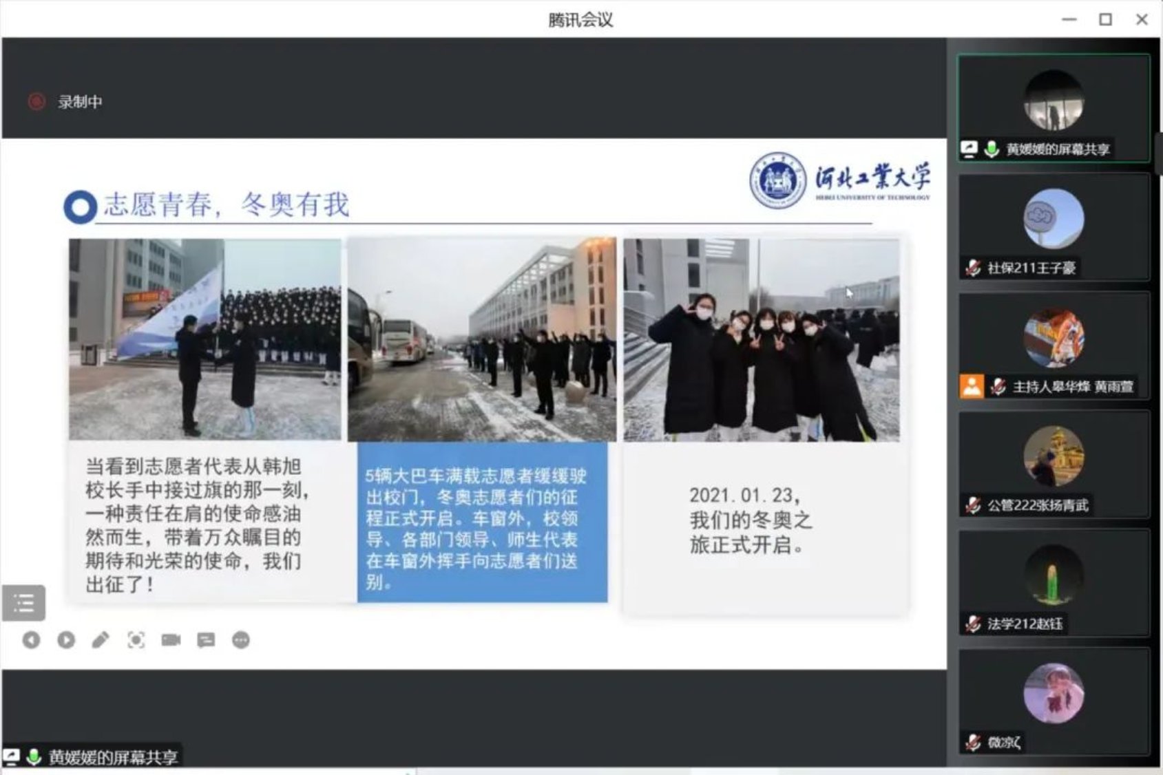 MPA201班黄媛媛同学从志愿服务和收获总结两个方面向大一文法学子娓娓道来。2021年的1月23日,冬奥志愿者们接过韩旭校长的志愿者旗帜,肩负使命,正式出发。