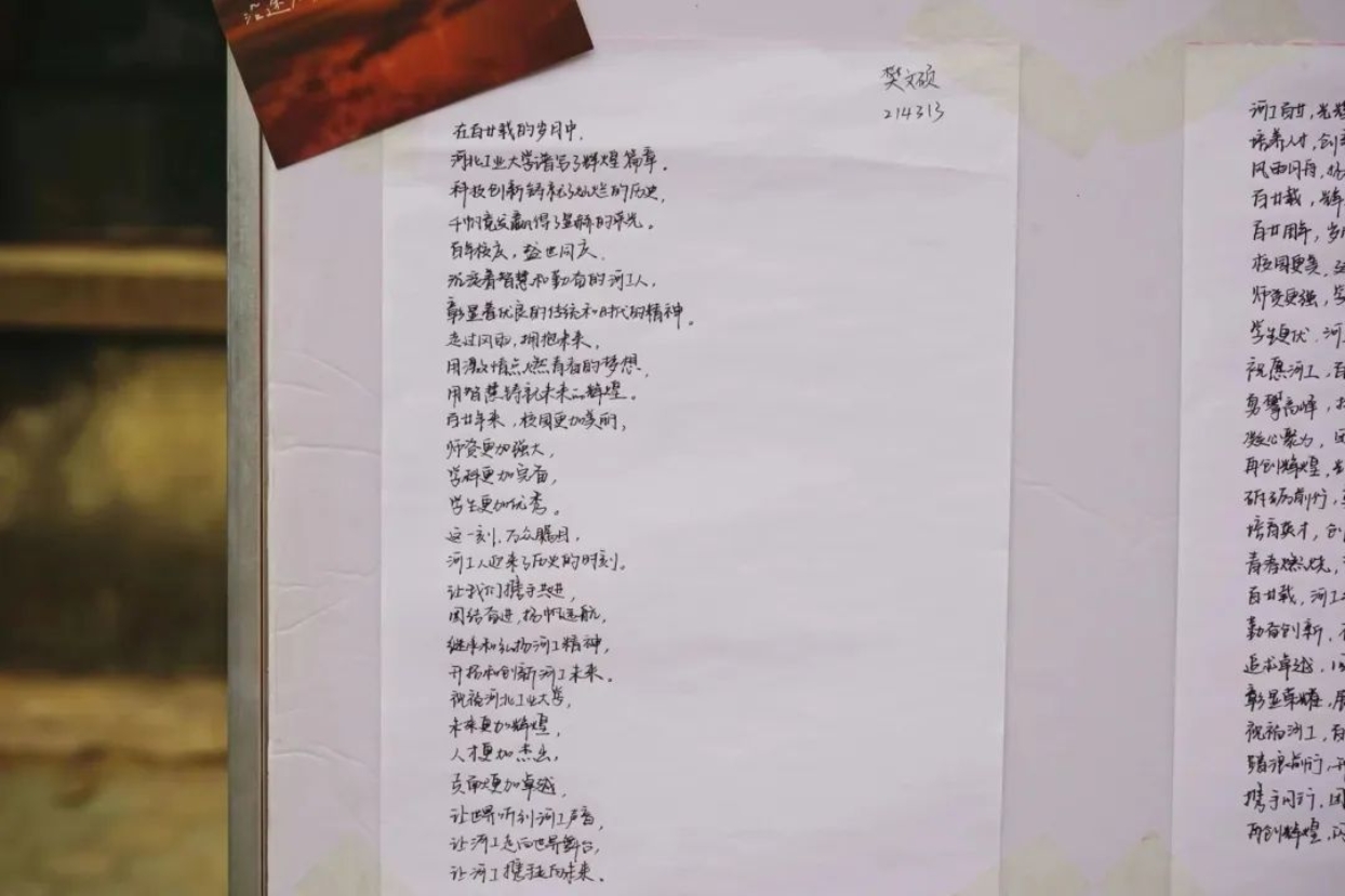 云雨浸润青城岁月,积淀下深厚底蕴;风霜打造今日辉煌,唱响出精彩华章。年轮转过,你成就了我,我延续了你。大家都有着独属于自己的河工大记忆,都有着对母校最真挚热烈的感情。一张张DIY贺卡,倾诉了大家内心对母校的万千情谊,为学校百甘献上这份珍贵的贺礼。活动现场上挤满了人群,同学们排起了队伍,都想通过贺卡送上自己的祝福。一张张小小的贺卡,承载着我们对母校深深的爱意。