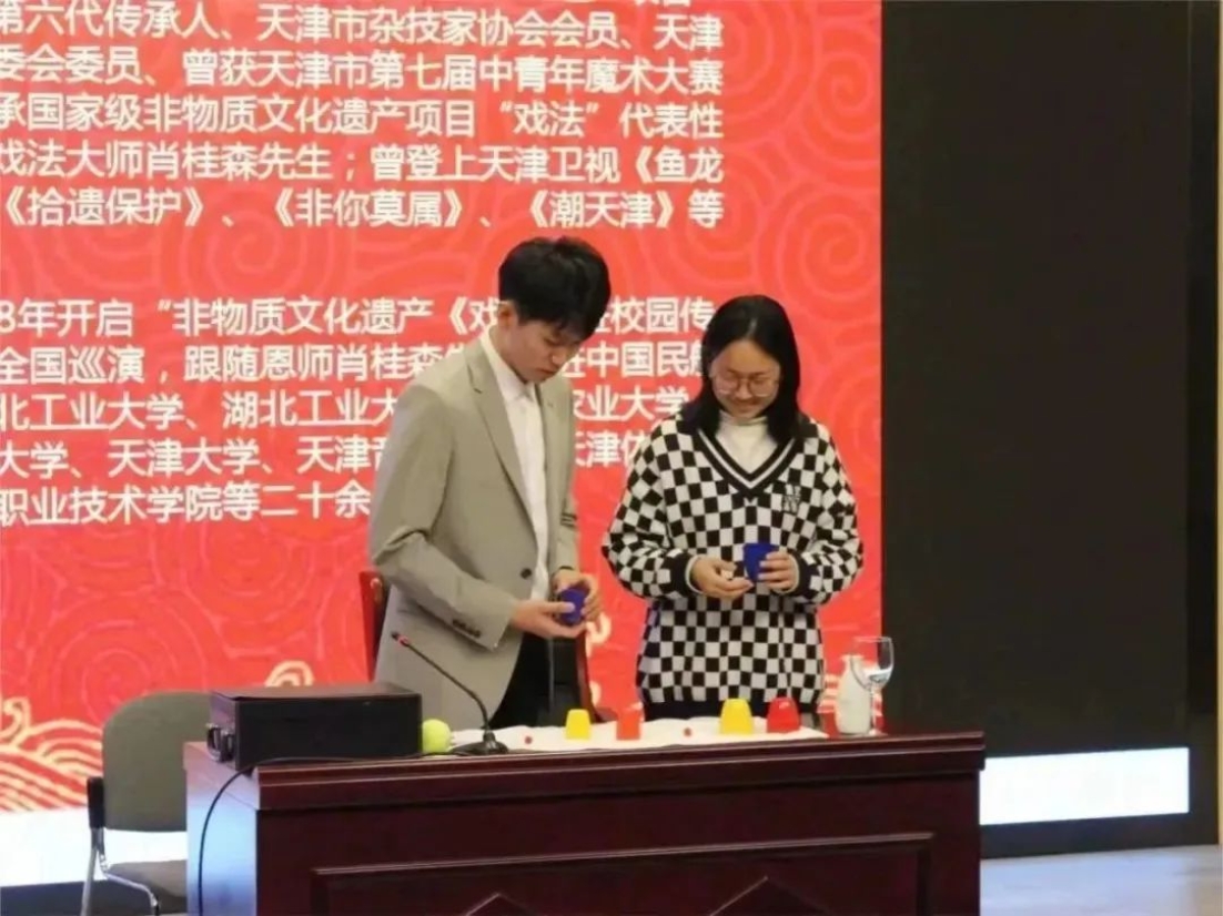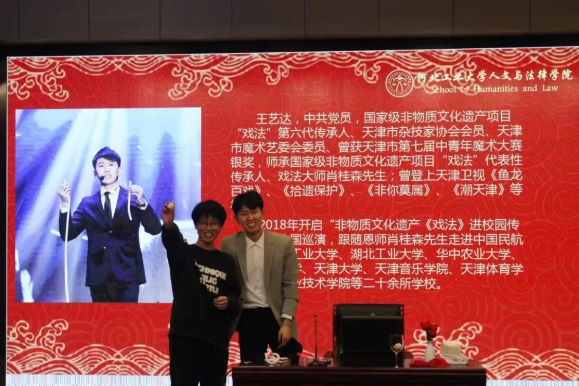 为使同学们深入了解古彩戏法的艺术魅力,认识到肩上所担负的传承非遗、延续传统文化的重任,增强我们的文化自信,在推动时代进步的同时让千年的中华文明经久不息、源远流长,黄色片 中文系邀请到了国家级非物质文化遗产项目“戏法”第六代传承人、天津市杂技家协会会员、天津市魔术艺委会委员王艺达,于3月24日下午2点在黄色片 红桥校区东院7D101为大家讲解戏法的历史起源、戏法的传承与发展现状、戏法与魔术的区别等古戏法相关的知识。