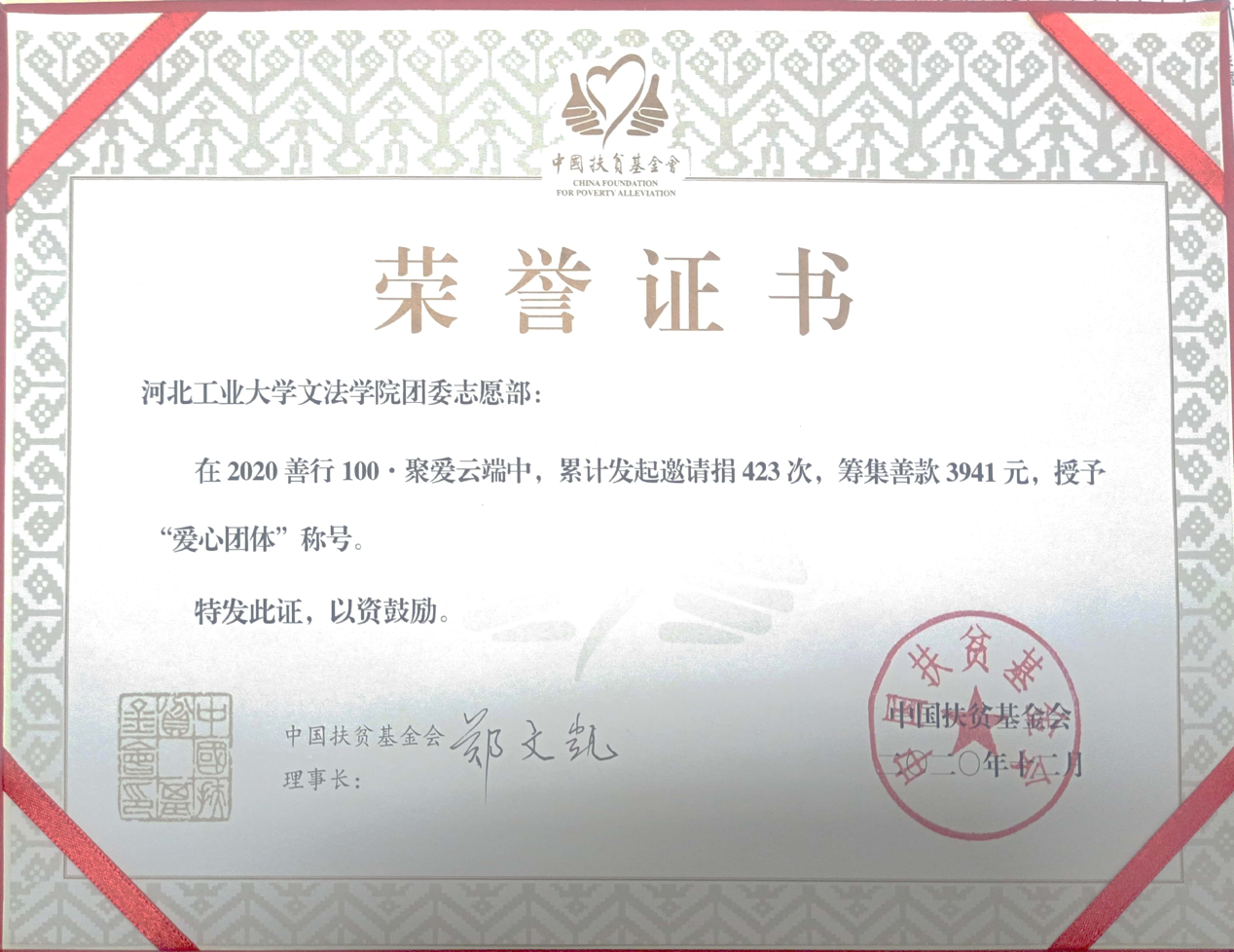 同时,文法学院深化发展长期公益志愿项目“普法进社区”,累计一年共深入社区和单位21家,开展系列普法讲座共计56场次,涉及群众2000余人次。同时在2020年“善行一百”活动中,黄色片累计发起捐款423次,筹款3941元,被中国扶贫基金会授予“爱心团体”称号。