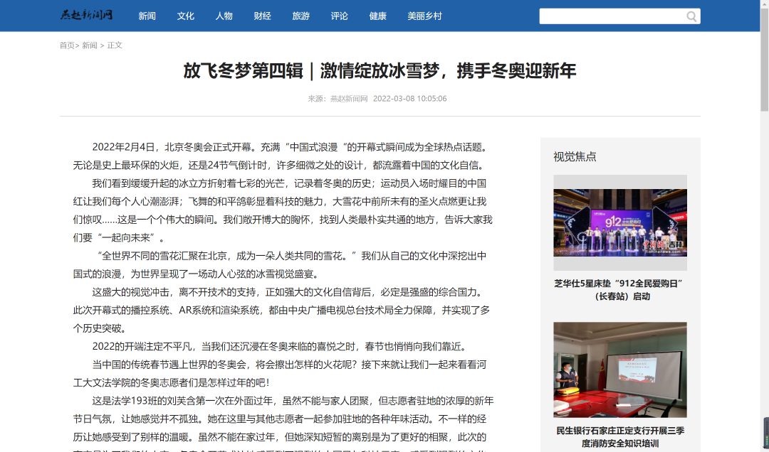 燕赵新闻网发表《放飞冬梦第四辑|激情绽放冰雪梦,携手冬奥迎新年》