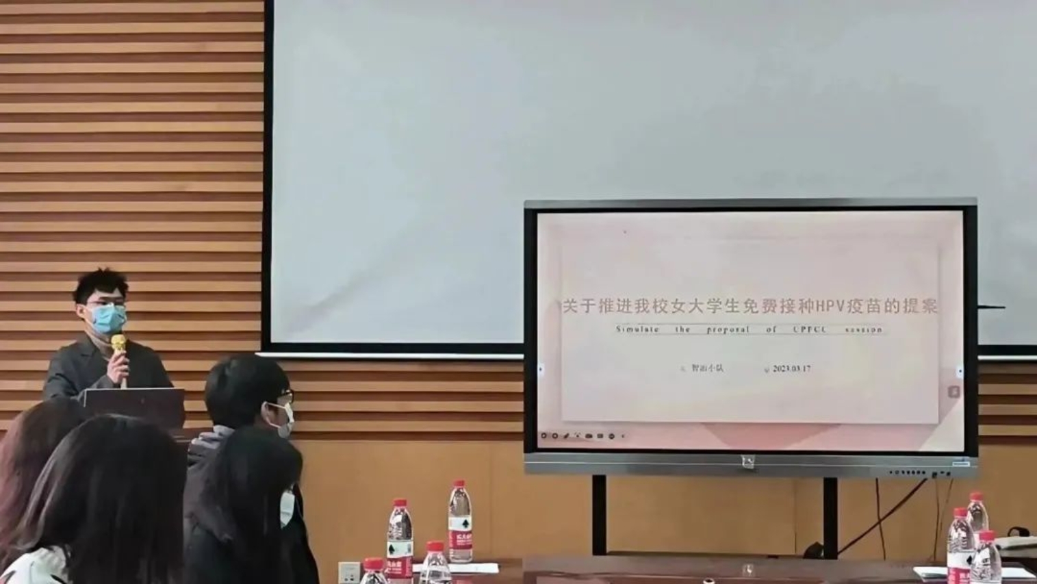 接着,主持人向大家播放了科普短片,短片通过生动的动画向我们展现政协的作用以及提案的相关信息。随后,提案组成员进行了“关于大学生视力保护提案”、“关于推进我校女大学生免费接种HPV疫苗提案”、“关于切实推行快递包装有效回收提案”和“关于校园空瓶回收提案”的集中展示:“关于大学生视力保护提案”从我国大学生近视率近年来不断上升的现状开始,通过展示具体的数据,向我们阐明了问题的重要性;“关于推进我校女大学生免费接种HPV疫苗提案”从对HPV疫苗的介绍开始,介绍了中国HPV疫苗的行业发展状况,由此提出了接种HPV疫苗是现实所趋,民心所向的问题,最后提出了推动适龄女孩HPV疫苗免费接种建议;“关于切实推行快递包装有效回收提案”从快递包装会对环境产生污染的现象出发,认真分析了快递包装产生污染的原因与背景,并在最后提出了具体的奖惩机制、实施方式以及监督机制,这为校园实践该提案提供了明确的指导;“关于校园空瓶回收提案”从社会现象出发,揭露了塑料瓶资源浪费的现状,以及校园内废弃饮料瓶的现象,随后从需求、环保意识和客观设施缺失等方面分析了现象发生原因,接着针对相关原因,提出了具体的建议和解决措施,提出环保积分、智能回收机器等创新类概念。
