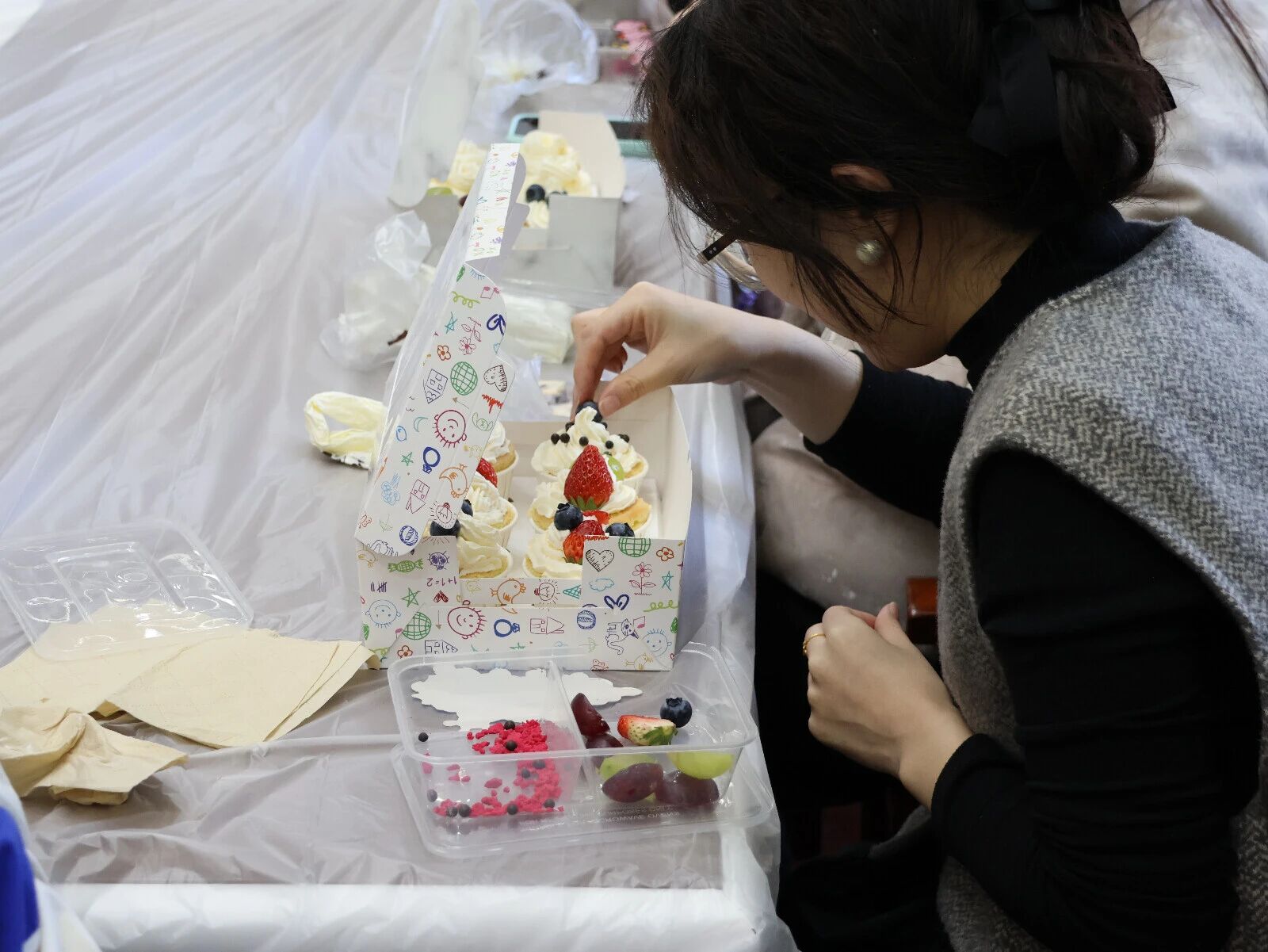 待糖霜缓缓飘落,草莓轻柔放置,原本纯净的纸杯瞬间焕发生机——有的点缀如少女心事般细腻,有的朴素如岁月沉淀般深沉,每一枚都是独特而珍贵的艺术表达。浓郁的奶香在空气中悄然弥漫,酝酿出一场关于甜蜜的梦幻之旅。